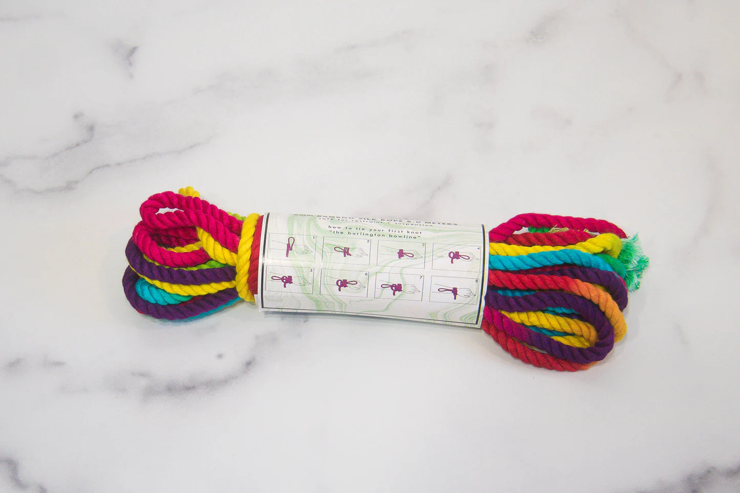 Emojibator's bamboo silk bondage rope combines vibrant rainbow aesthetics with practical performance. At 8 meters long and 6mm thick, this single-ply 3-strand design delivers a medium-tight twist that balances durability with comfort.