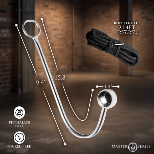 Elevate your bondage play with the Master Series Roped Anal Hook with Rope—designed for advanced anal and rope enthusiasts. This curved stainless steel anal hook, paired with 21 feet of shibari rope, delivers intense restraint, heightened control, and unforgettable BDSM experiences. Collar not included.