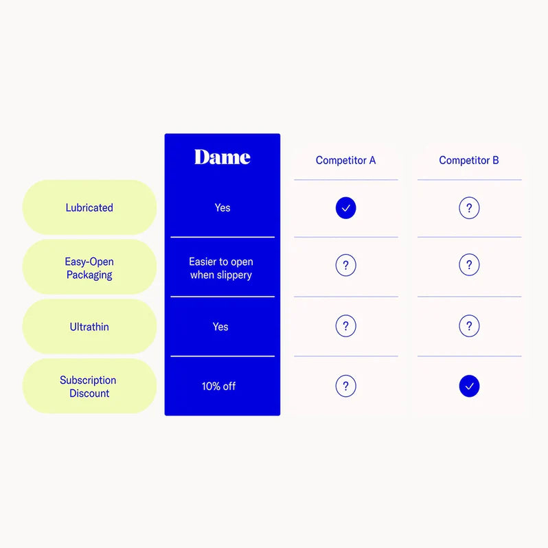 Meet Dame Condoms: Experience pleasure and protection. These ultra-thin condoms are designed to feel like they're hardly there, ensuring a natural and intimate experience. With a body-safe material, you can enjoy every moment without any added fuss. Perfect for enhancing those special intimate moments.