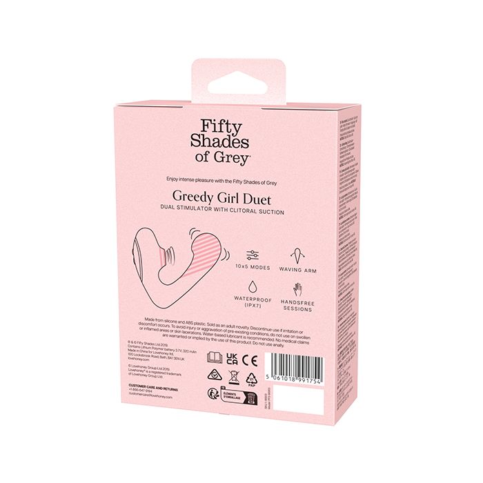 Experience blissful pleasure with the Fifty Shades of Grey Greedy Girl Duet. This sex toy offers powerful clitoral massage and internal G-spot stimulation. You can enjoy each function separately or combine them for an intense orgasm. It is a fantastic clitoral stimulator for fans of the books.