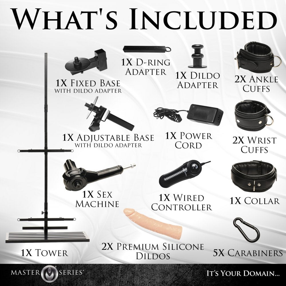 • Dungeon-Ready: The full set includes a tower, a sex machine, two premium silicone dildos, a collar, two wrist cuffs, two ankle cuffs, five carabiners, a fixed dildo adapter base, an adjustable dildo adapter base, and a D-ring adapter.