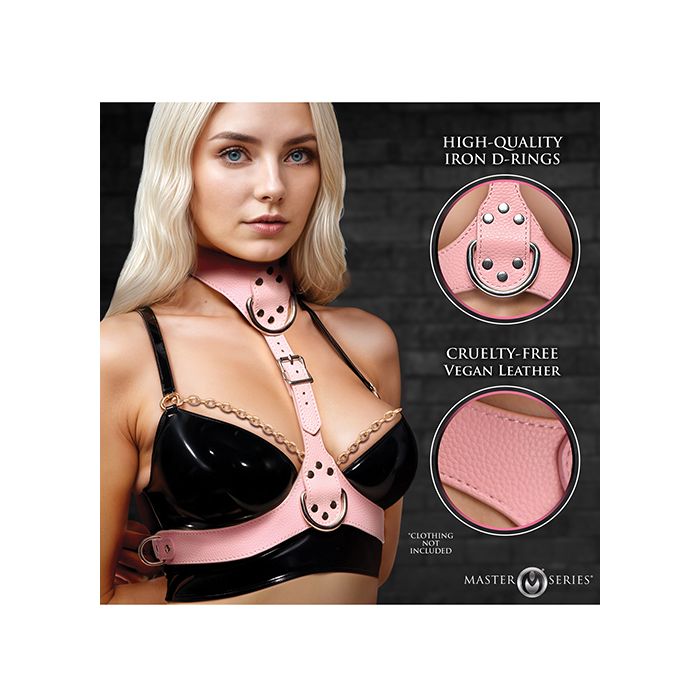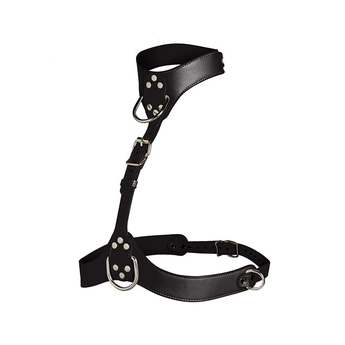 The built-in, adjustable collar adds a feeling of submission to your play. This chest harness also features two large D-rings. One is at the collar and the other is at the sternum. You can attach chains, leashes, or other bondage accessories to them for versatile fun.