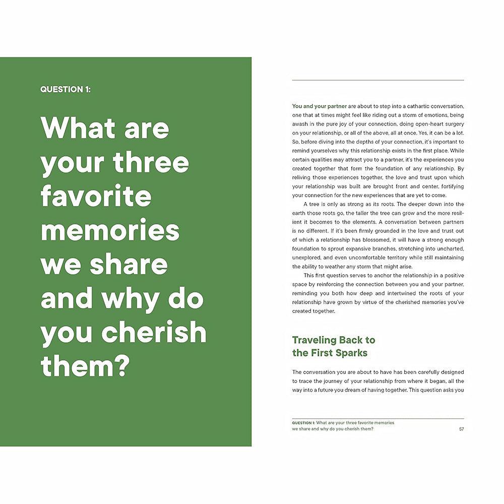 These 12 questions such as What is the pain in me you wish you could heal? have been proven to nurture authentic intimacy and amplify joy in your relationship, regardless of age, gender, or sexuality.
