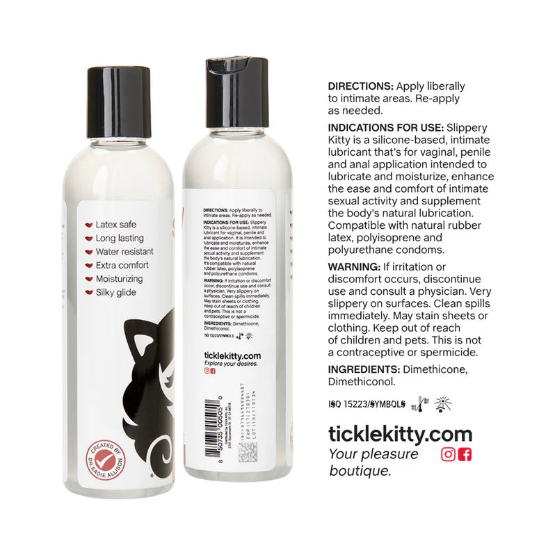 Slippery Kitty Silicone Lubricant offers an ultra-long-lasting, silky-smooth glide that stays put, even through shower or water play. Created by Dr. Sadie Allison using medical-grade silicone, it gently reduces friction and protects sensitive skin, enhancing comfort and pleasure. Experience uninterrupted intimacy with a lubricant designed to keep your moments effortless and delightfully smooth. 4 fl oz