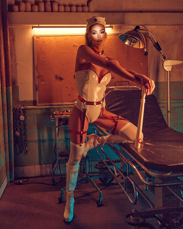 This costume features a stunning white vinyl bodysuit. It has a super deep sweetheart neckline with a bold red trim that shows off your assets. The matching red metallic choker has a first aid logo to let everyone know you're on duty.