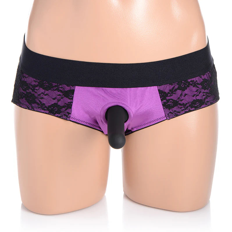 This crotchless harness keeps you ready for action. The lingerie style and universal O-ring allow you to wear your strap-on with confidence. The Lace Envy fits large to extra-large sizes. Its wide elastic strap comfortably secures your dildo.